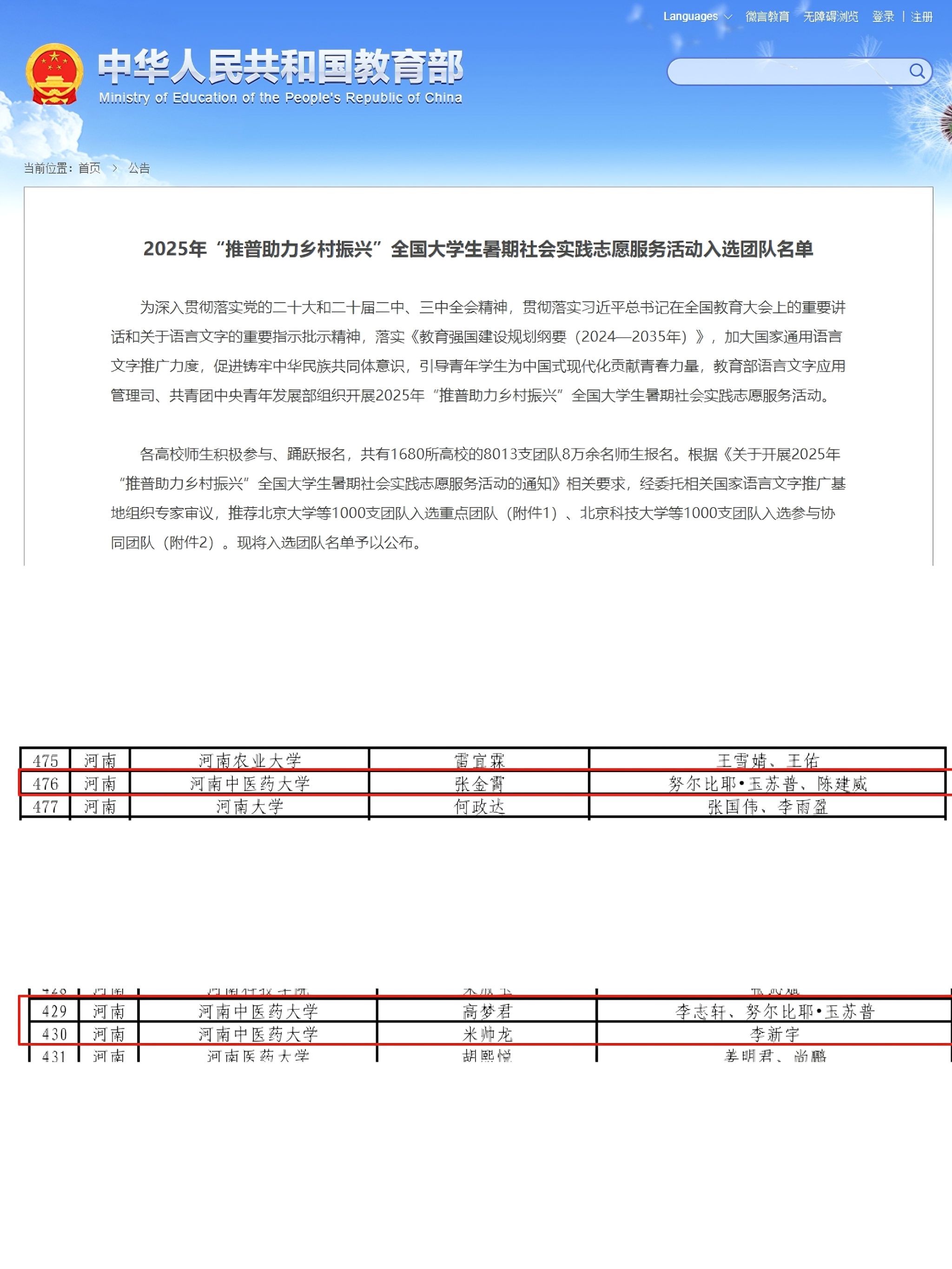 出彩丨我校“杏林丹若坊”工作室团队入选教育部2025年“推普助力乡村振兴”全国大学生暑期社会实践志愿服务活动