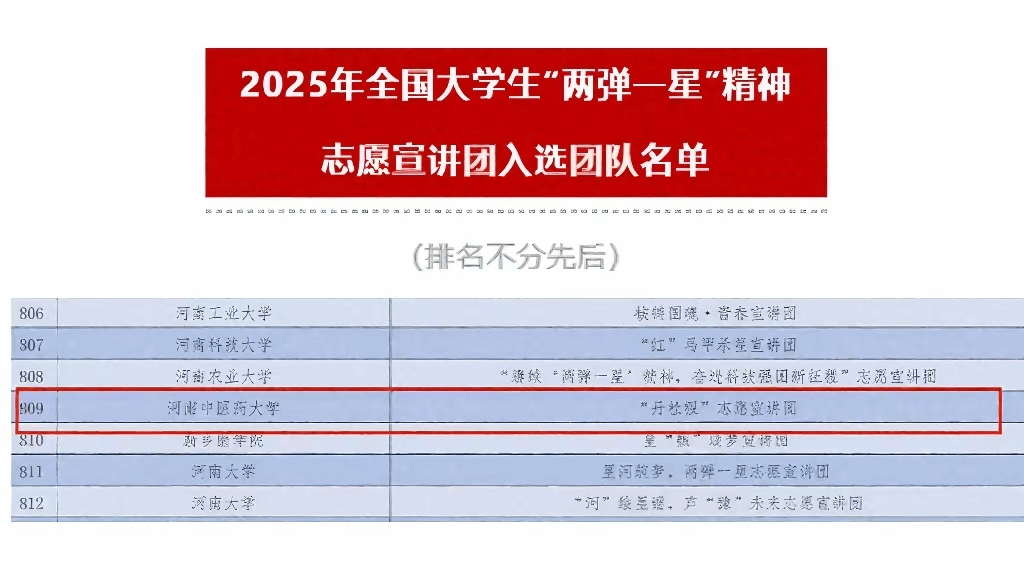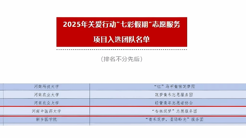 本网讯(文/图 于嘉明)近日,教育部、共青团中央、中国青年志愿者协会,先后公布了多项全国大学生社会实践志愿服务团队入选名单,其中中医学院(仲景书院)、仲景书院“杏林筑梦”志愿服务团成功入选2025年关爱行动“七彩假期”志愿服务团;尚真书院“丹桂橙”志愿宣讲团成功入选2025年全国大学生“两弹一星”精神志愿宣讲团;河南中医药大学“杏林丹若坊”工作室两支社会实践服务团队分别入选“推普助力乡村振兴”全国大学生暑期社会实践志愿服务重点团队和协同团队,第一临床医学院“语润天山,同心筑梦”志愿者服务团入选“推普助力乡村振兴”协同团队。