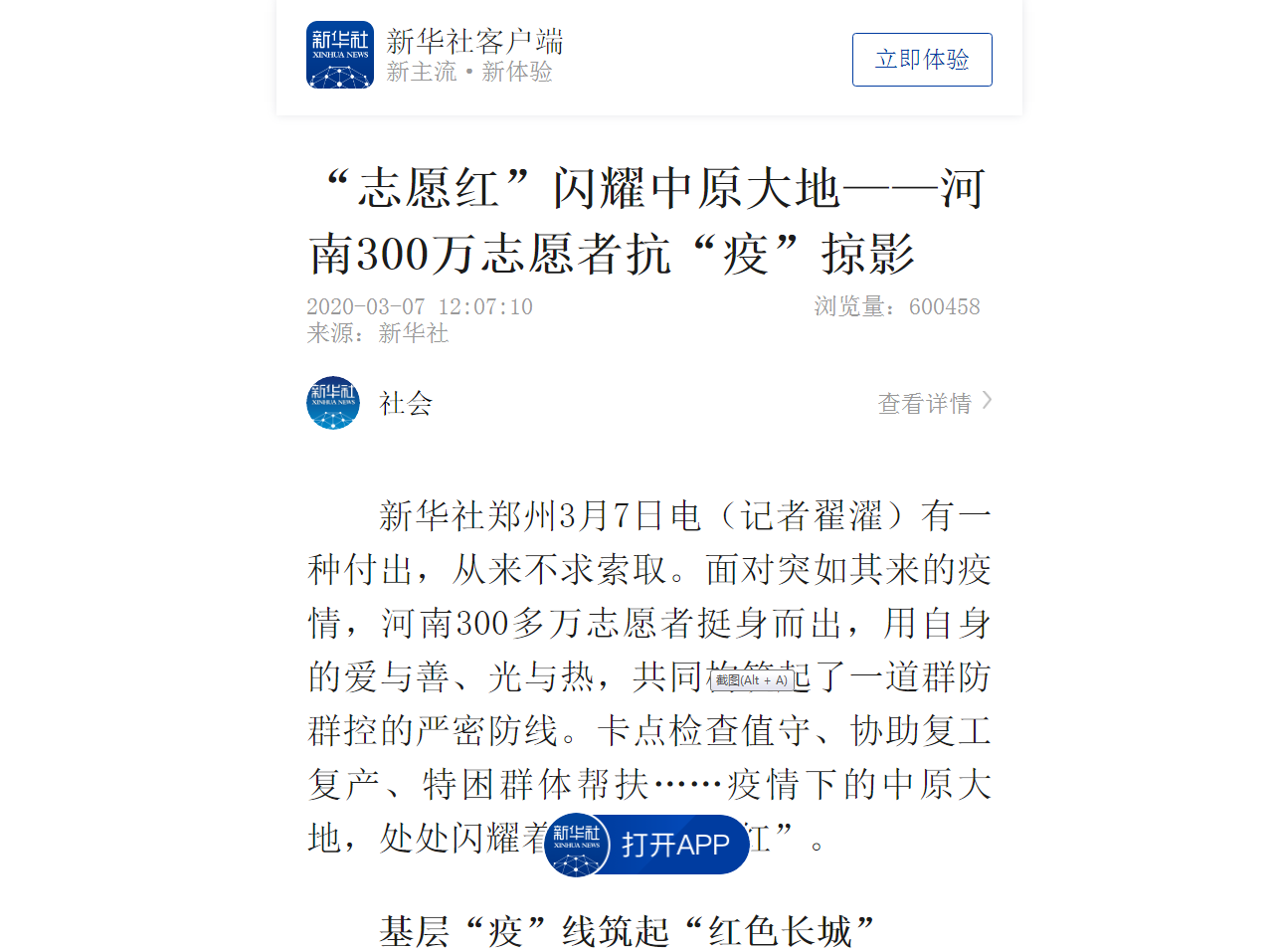 新华社郑州3月7日电(记者翟濯)有一种付出,从来不求索取。面对突如其来的疫情,河南300多万志愿者挺身而出,用自身的爱与善、光与热,共同构筑起了一道群防群控的严密防线。卡点检查值守、协助复工复产、特困群体帮扶……疫情下的中原大地,处处闪耀着最美“志愿红”。