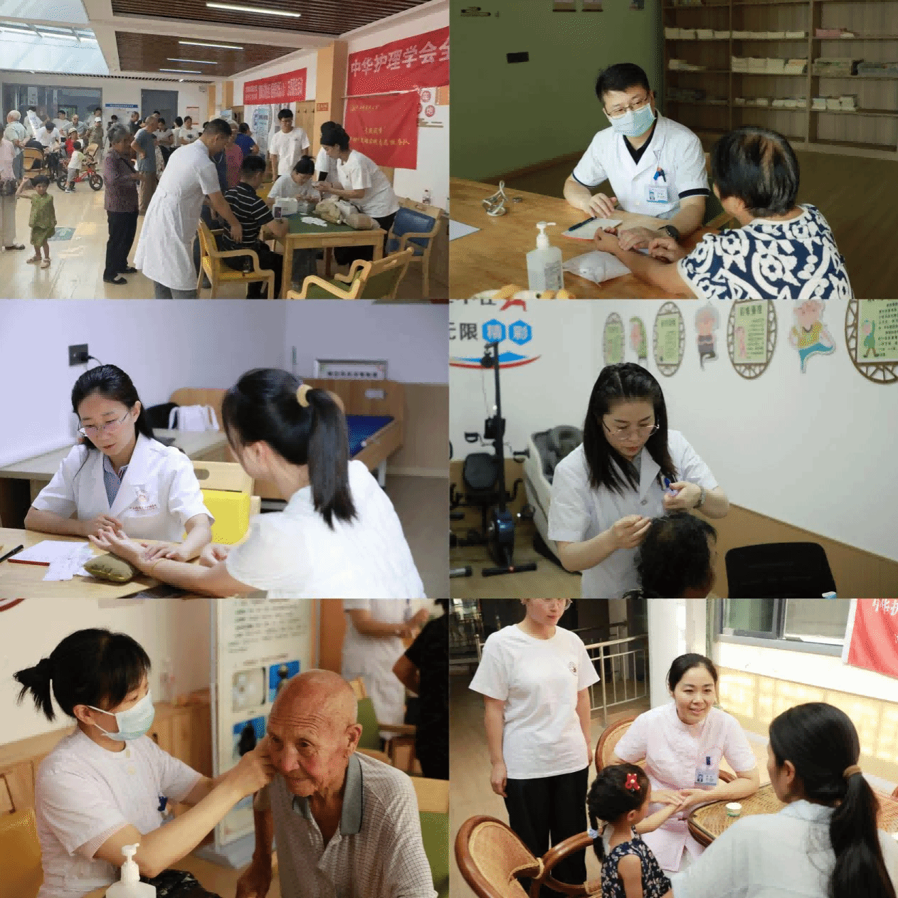 仁心仁术惠民生,中医护理谱新章。实践队联合学校一附院医护团队将中医药健康服务送至百姓身边,为社区群众建立“一对一”的健康档案。义诊现场,专家们把脉问诊,开展科普宣讲,提供个性化诊疗建议;护理骨干施展特色疗法——三伏贴、铜砭刮痧、小儿推拿等。学生志愿者将课堂所学运用到服务群众的实践中,开展耳穴压豆治疗、血糖血压监测、八段锦功法展示。精心配制的避瘟香囊与养生药茶承载着“治未病”的古老智慧。药香氤氲处,传统中医技艺与现代护理理念交相辉映,生动诠释了“智慧康养”的内涵。